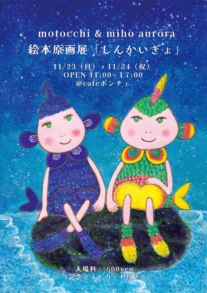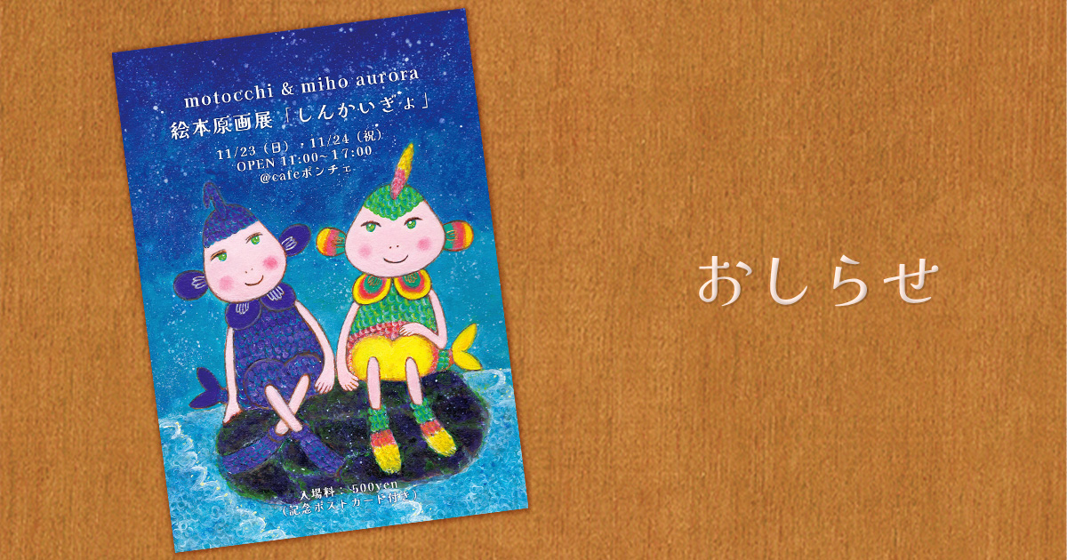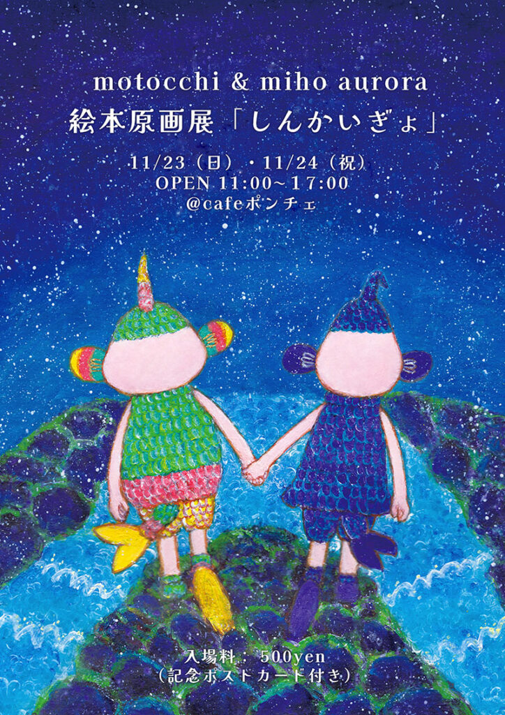 今回の個展は、昨年、miho aurora(ミホオーロラ)さんの自費出版という形で世に放たれた「しんかいぎょ」という絵本の、原画展になります。